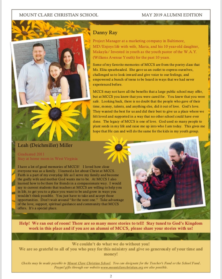 Mount Clare Christian School currently has three openings for teaching staff. We are looking for an Elementary Assistant Teacher, a Supervising Teacher in High School and an Assistant Teacher at the High School level. Our mission is to provide a quality Christ-centered education for children in our neighborhood. MCCS is an evangelistic outreach of Wilkens Avenue Mennonite Church.